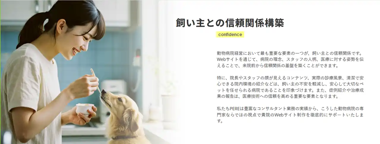 動物病院経営のコンサルティング及び支援事業を展開する株式会社PERE(本社:[都道府県市区町村]、代表取締役:[代表者名])は、関東圏を中心に約1,000軒の動物病院と取引を行ってきた実績とノウハウを活かし、動物病院に特化したホームページ制作およびWebマーケティング支援サービスを本格的に展開いたします。 |