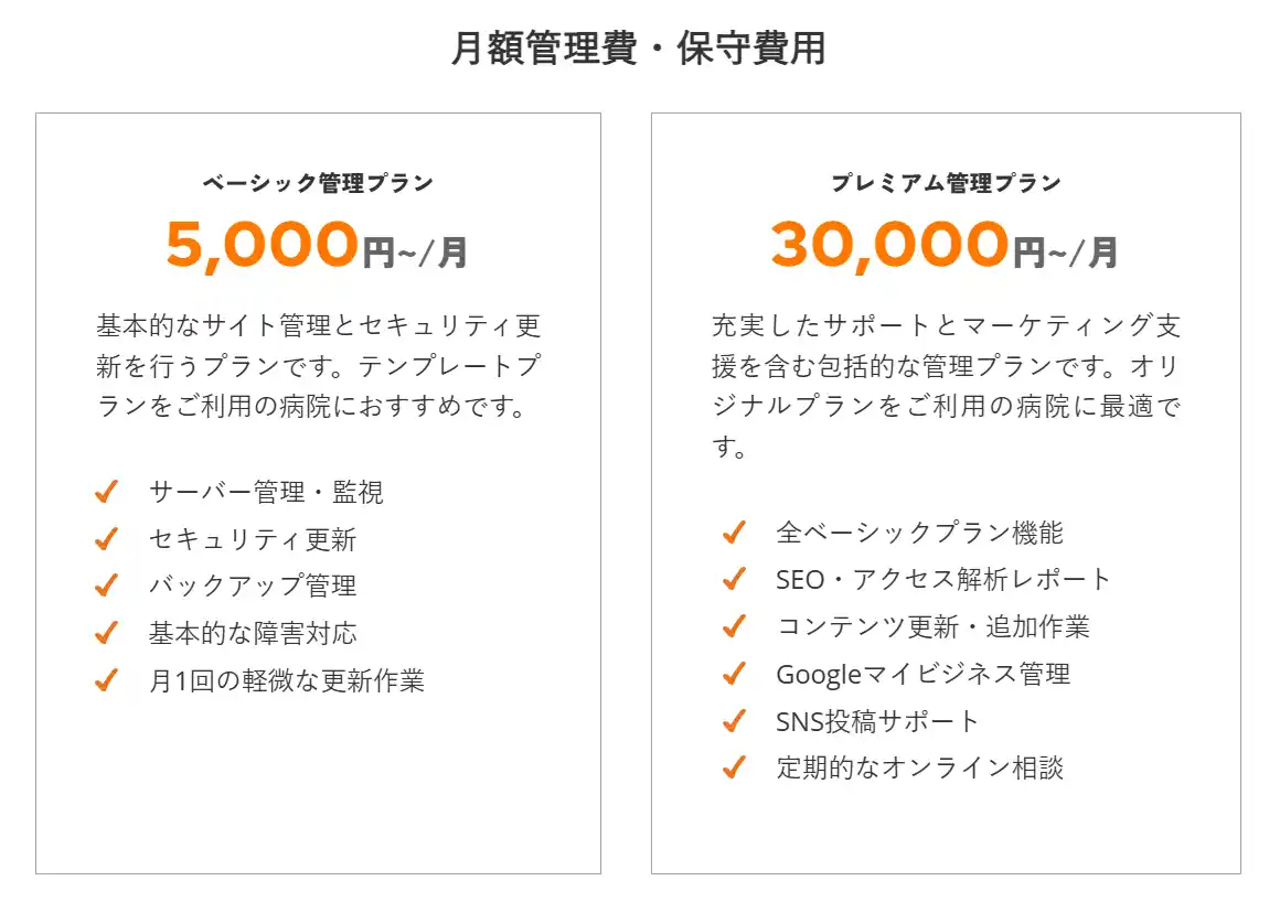 運用サポート(月額5,000円~): セキュリティ管理から、コンテンツ更新、SNS運用支援まで、病院の規模に合わせて選べるプランを用意しています。 |