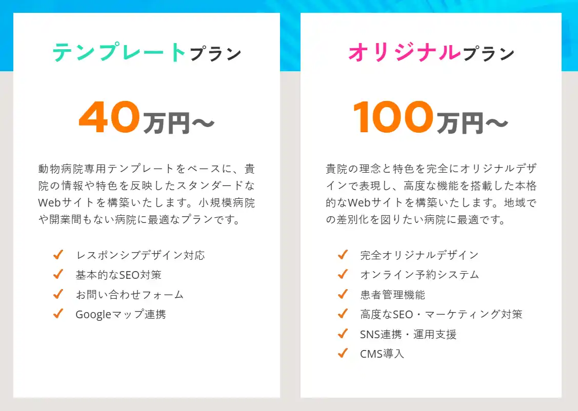 テンプレートプラン(40万円~): 動物病院専用テンプレートを使用し、低コストかつ短期間で高品質なサイトを構築。開業初期の先生におすすめです。 |