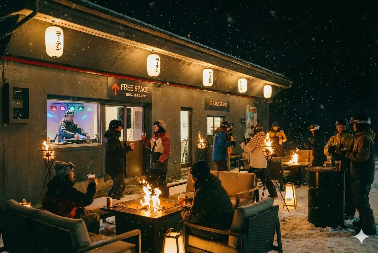 雪上に浮かぶ提灯の灯り、会話を彩る音楽、そして身体を温める食事とお酒。石打丸山での一日を幸福な余韻で満たす、特別なベースエリアを演出します。 |