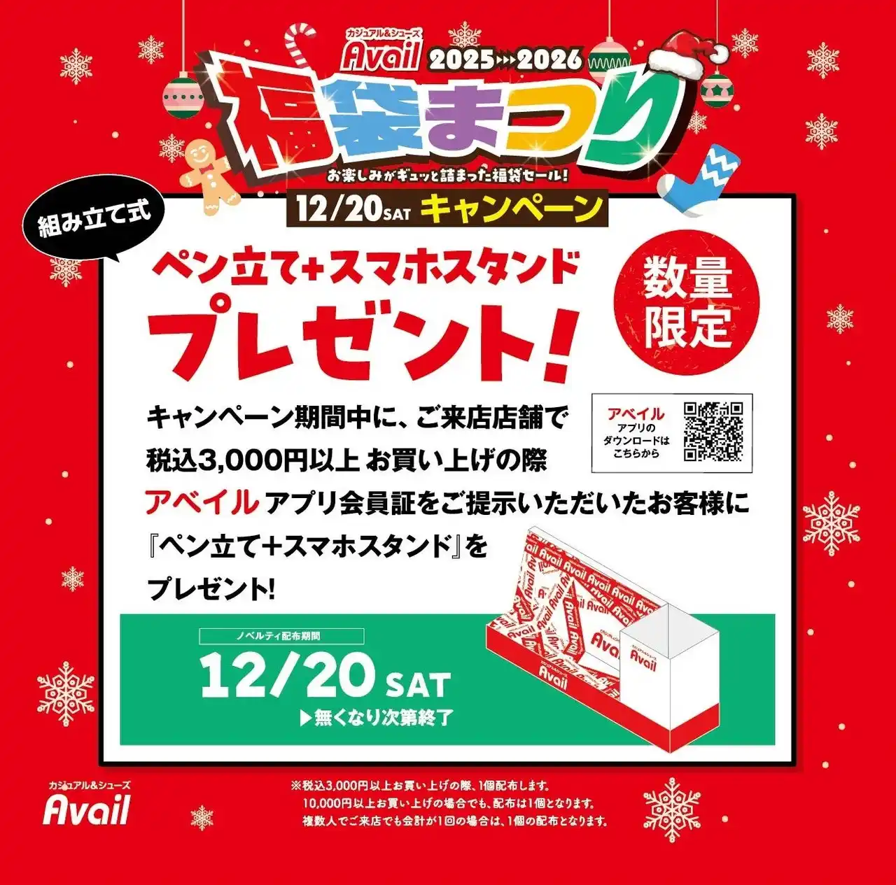 | 12/20(土)より、店舗で税込3,000円以上お買い上げのうえ、アベイルアプリの会員証をご提示いただいたお客様を対象に、アベイルオリジナルの「ペン立て+スマホスタンド」をプレゼントします。なくなり次第終了となります。 | |||