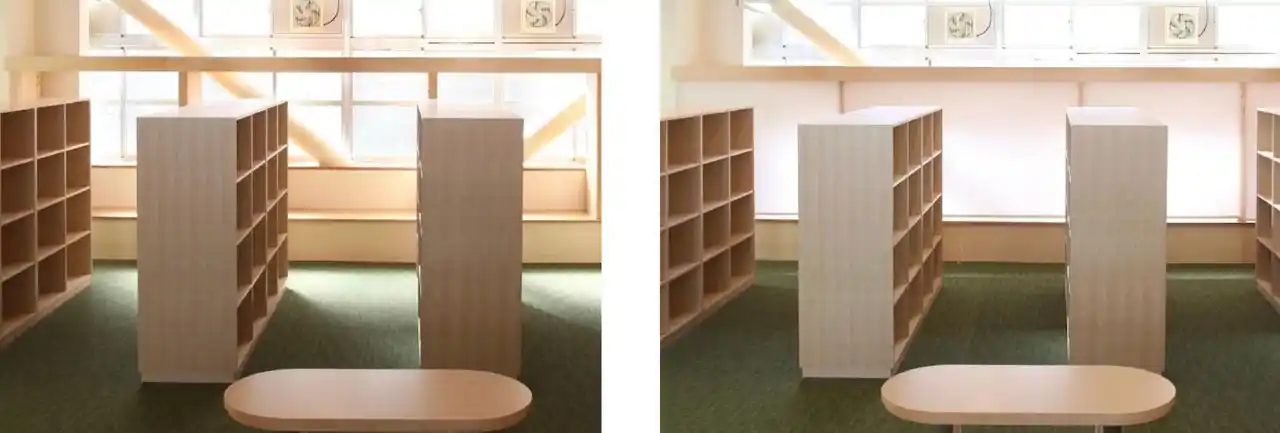 完成した『おこもりスペース』(写真左:ロールカーテンが上げられた状態、写真右:ロールカーテンが下げられた状態) |