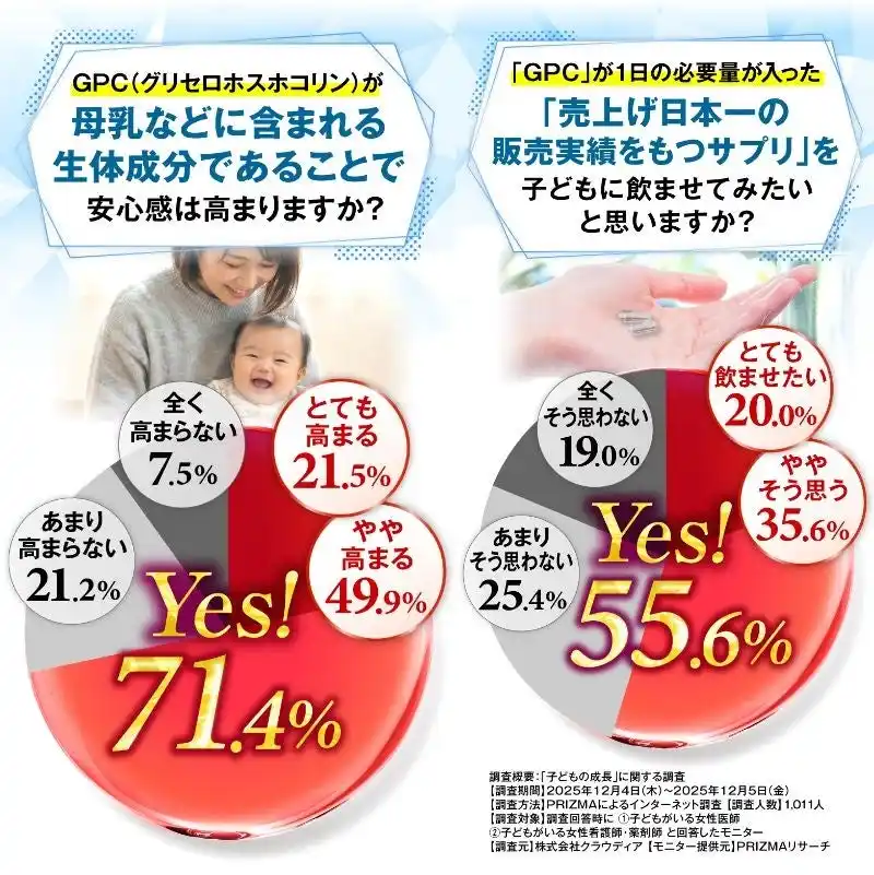 同年代の子どもとの体格差や健診結果に不安を感じる一方で、成長期には「栄養バランス」や「睡眠」が重要と考えられていること、また母乳にも含まれる生体成分「GPC(グリセロホスホコリン)」が、子どもの成長サポートに期待されていることが明らかになりました。 |