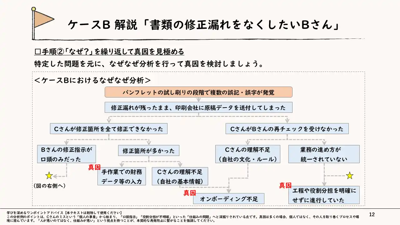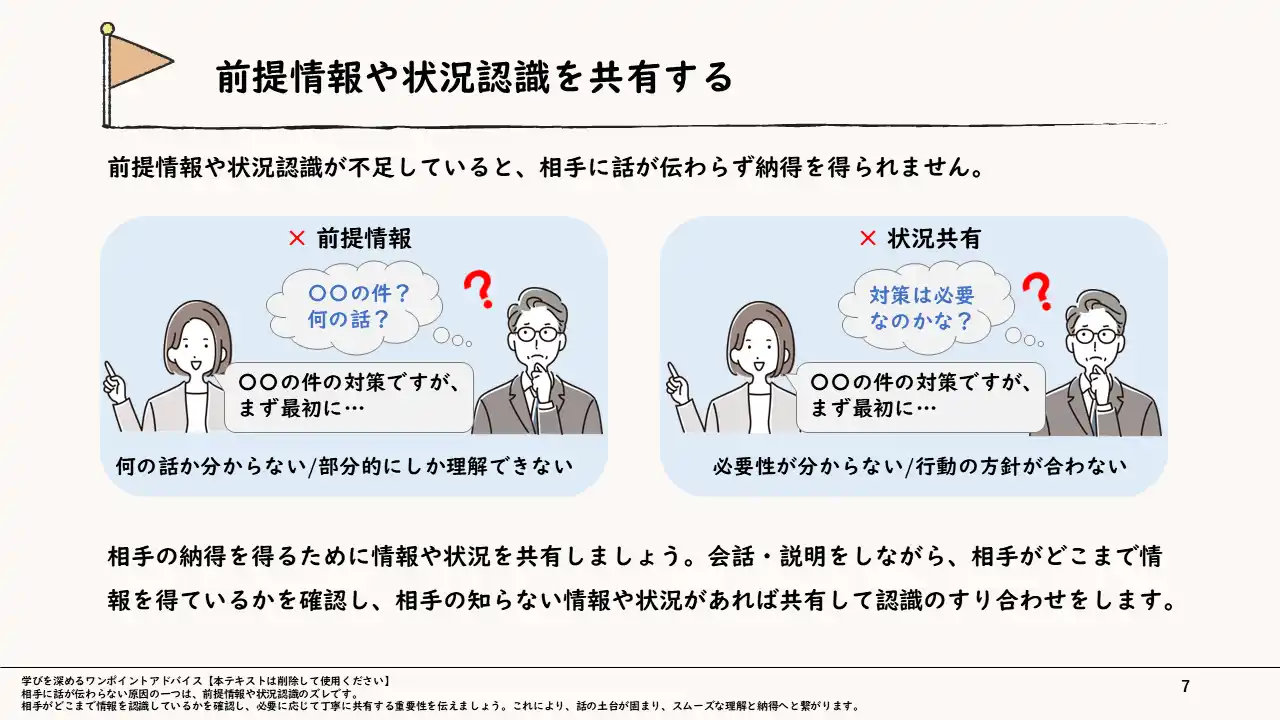 各スライドには講師向けの「ワンポイントアドバイス」が記載されており、経験の浅い社内講師でも自信を持って進行できます。 |