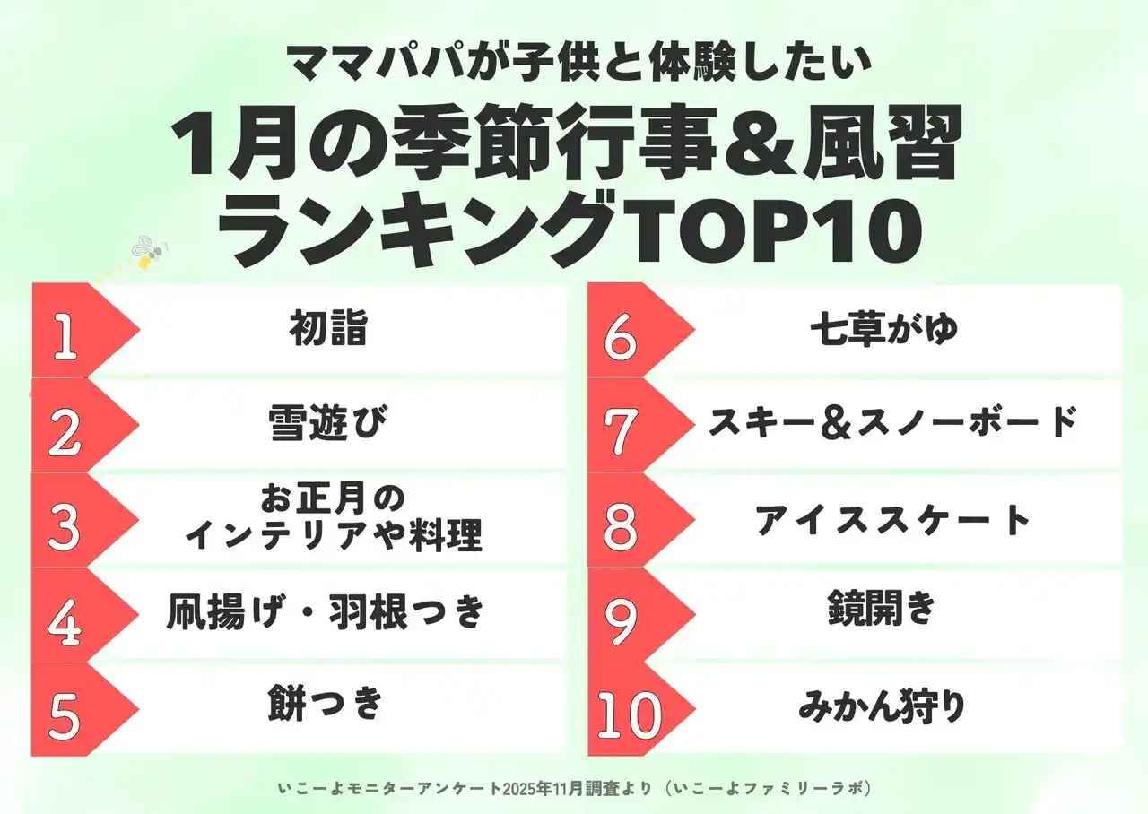| 国内最大級の子供とお出かけ情報サイト「いこーよ」を運営するアクトインディ株式会社(東京都品川区 代表取締役:下元敬道 以下、アクトインディ)では、アンケート調査や取材からリアルな親子の行動を浮き彫りにする「いこーよファミリーラボ」にて、「子育て世帯の1月の過ごし方年齢別調査」について調査・分析を行いました。 | |||||||||||||||