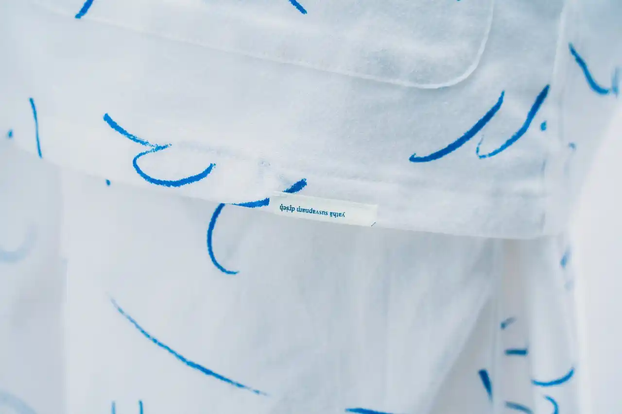 本コラボレーションでは、アーティスト Yuki MIKAMI が描き下ろした、寝言やいびきといった“眠りの音”をイメージした線画を採用。 Tempo by known unknown のケーキパッケージで使用しているカラーを基に調整した、オリジナルのブルーインクで生地にプリントした特別なテキスタイルを制作しました。 |