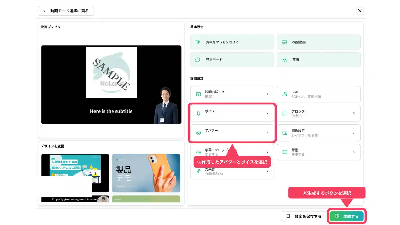 そのあと、設定画面で、先ほど作成したアバターと作成したボイスもしくは、搭載されているボイスの中の一つを選択して動画を生成。 AIが資料の内容を解析・翻訳し、構成から台本作成、そしてあなたのアバターによるナレーションまでを全自動で行い、数秒~数分で海外顧客向けの営業動画が完成します。 |