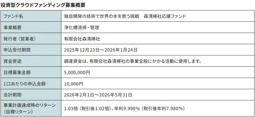 ソニー銀行株式会社(代表取締役社長:南 啓二/本社:東京都千代田区/以下 ソニー銀行)は、2025年12月23日(火)より、投資型クラウドファンディングのプラットフォーム「Sony Bank GATE」において、有限会社森清掃社を営業者として出資募集の取扱を開始しますので、お知らせします。なお、香川県内企業として初の Sony Bank GATE ファンド組成となります。 |