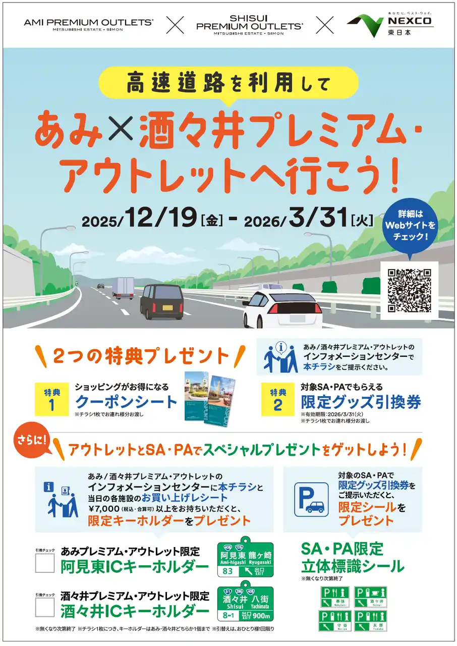 三菱地所・サイモン株式会社が運営するあみプレミアム・アウトレット(茨城県稲敷郡阿見町)および酒々井プレミアム・アウトレット(千葉県印旛郡酒々井町)では、株式会社ネクスコ東日本エリアトラクトと連携し、2025年12月19日(金)~2026年3月31日(火)の期間(※)、アウトレットと高速道路のサービスエリアおよびパーキングエリア(SA・PA)をあわせて利用すると特典が受けられる「高速道路を利用してあみ×酒々井プレミアム・アウトレットへ行こう!」キャンペーンを開催します。 |