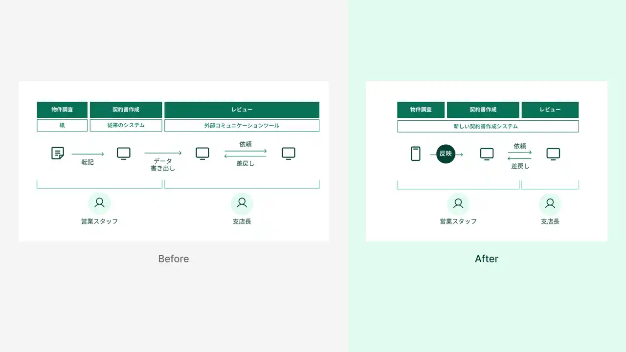| 本取り組みにより、物件調査から契約書作成に至る一連のプロセスで大きな改善が生まれています。 | |||