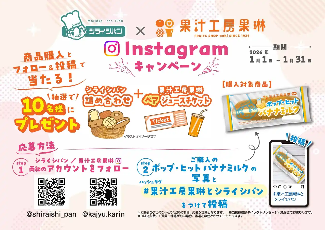 また、発売を記念し、『ポップ・ヒット バナナミルク』を購入のうえ、Instagram公式アカウントをフォローし投稿いただいた方の中から抽選で10名様に、シライシパンの商品詰め合わせと果汁工房果琳のペアジュースチケットが当たるキャンペーンを、2026年1月1日(木)から2026年1月31日(土)まで実施いたします。 |