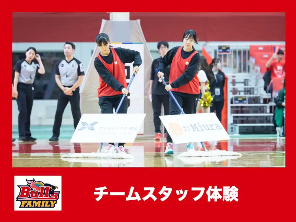 ・試合前:選手のロッカールームの準備 ・試合中:コートスイーパー(モッパー) ・試合後:記者会見を見学 非売品のスタッフ専用Tシャツに選手の 直筆サインももらえます! |