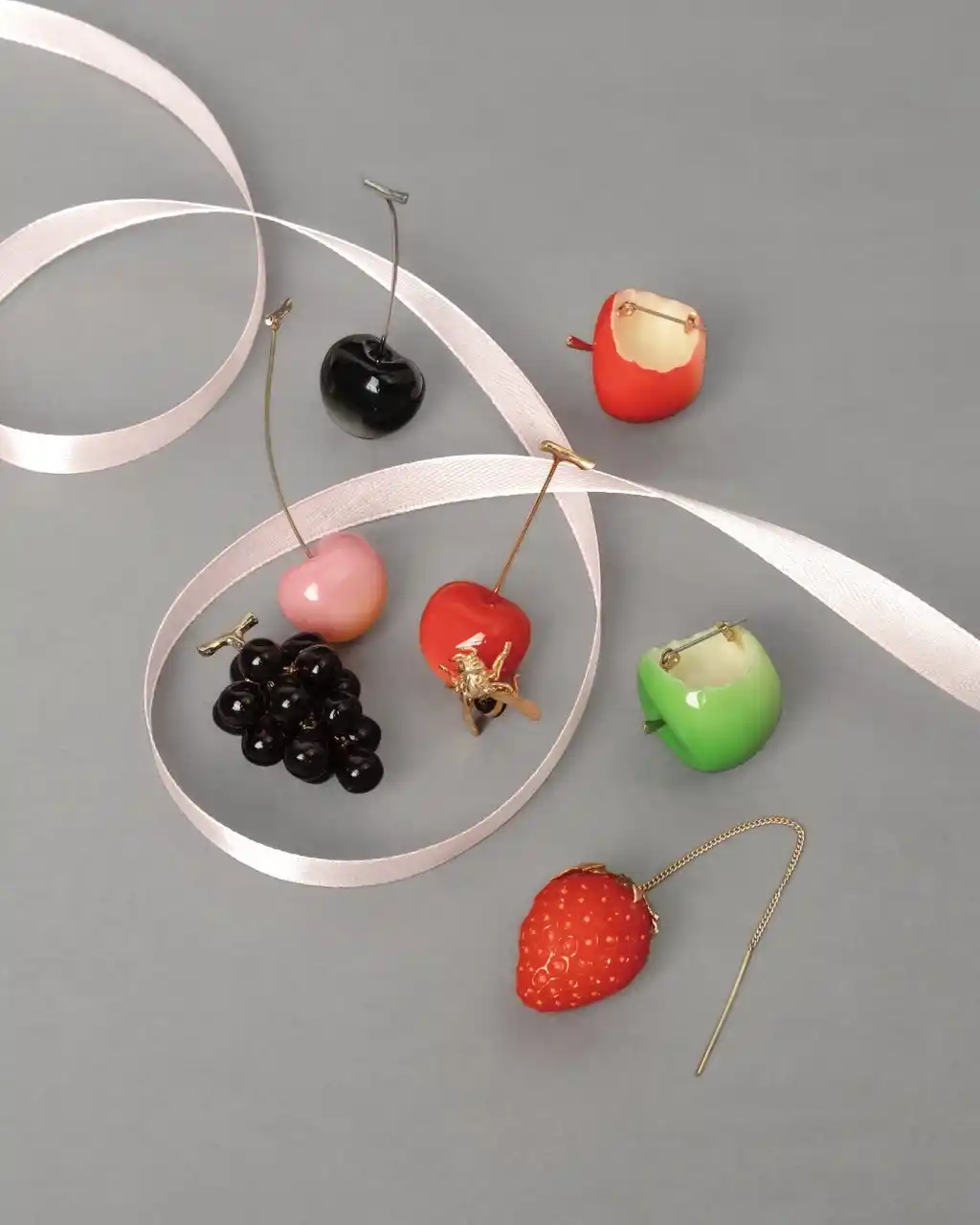 サクランボのヘタやブドウの一粒をキャッチにしたピアスなどのディティールに、デザイナーの遊び心を感じられます。 |