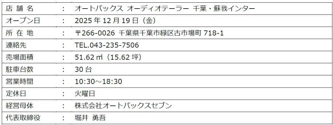 株式会社オートバックスセブン(代表取締役 社長:堀井勇吾)は、グループ初となるカーオーディオ特化型店舗「オートバックス オーディオテーラー 千葉・蘇我インター」を、2025年12月19 日(金)に千葉市緑区にオープンいたします。 |