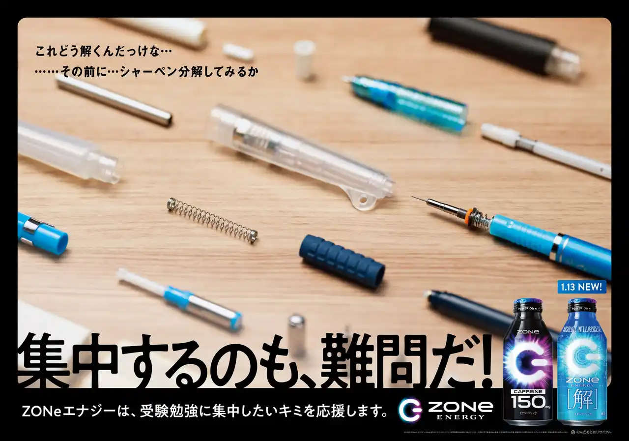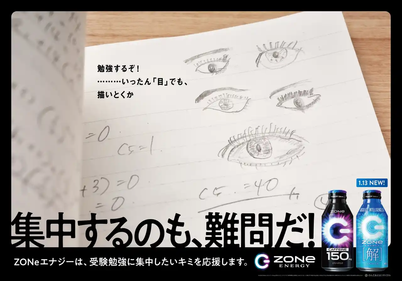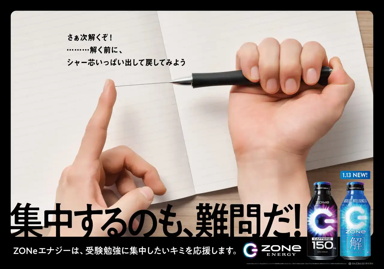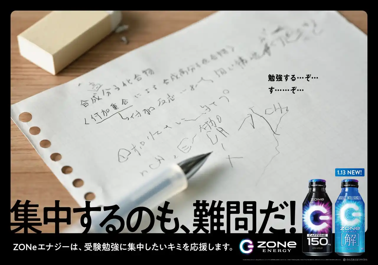 | 「ZONe ENERGY (ゾーン エナジー)」は、すべての受験生に寄り添うべく、2023年より、受験応援メッセージの掲出並びに「Big Luck」「Big Luck 2024」「ABSOLUTE VICTORY」と、“受験応援”を題材とした商品を発売してきました。今回は、勉強の合間の時間にフォーカスし、「自分もやっていたかも!」と共感できるような広告を、12月15日(月)よりJR総武線や、受験生が利用する主要駅で展開しています。また、すべての受験生に無敵の[解]を授けることをテーマに開発した、受験応援新商品「ZONe ENERGY [解]」を、2026年1月13日(火)に発売します。「ZONe ENERGY」が、本番に向けて頑張る受験生の励みになることを願っております。 | |||||||||||||||