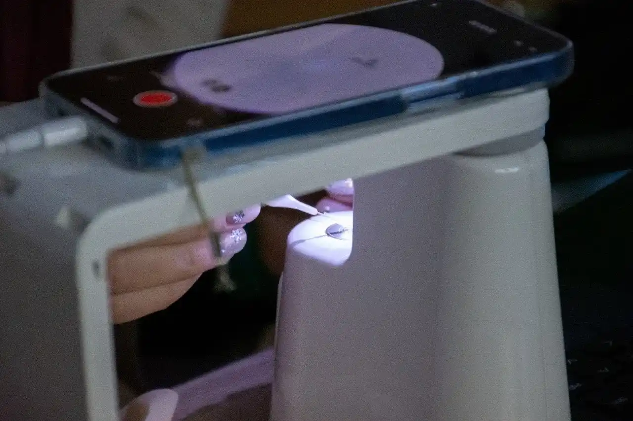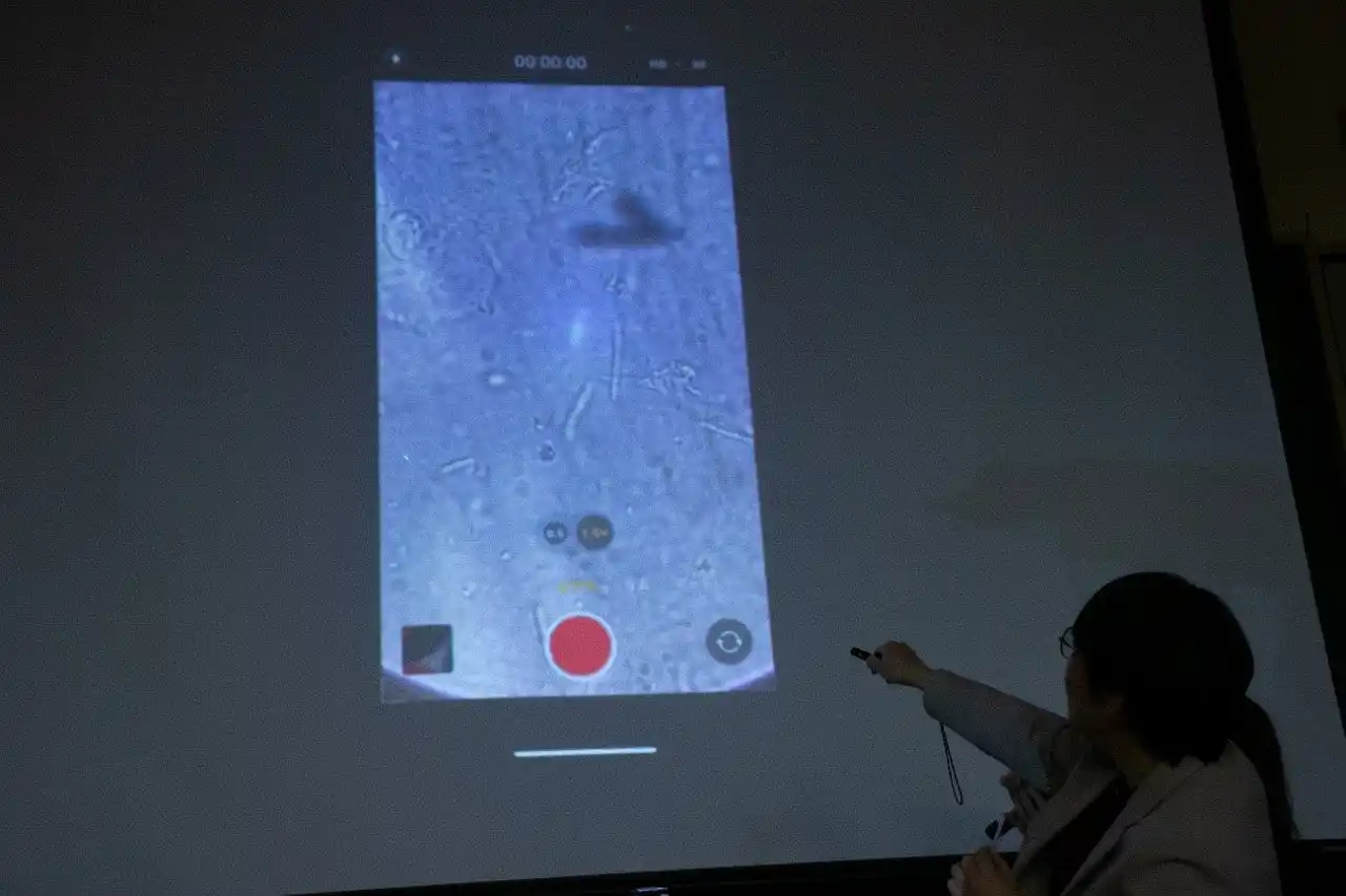 後半では、スマートフォンで微生物を観察できる顕微鏡を使い、実際にお口の菌を見る体験をしました。動く菌を見て子どもたちからは、「いっぱいいる」「気持ち悪い!」などの声が上がりました。 |