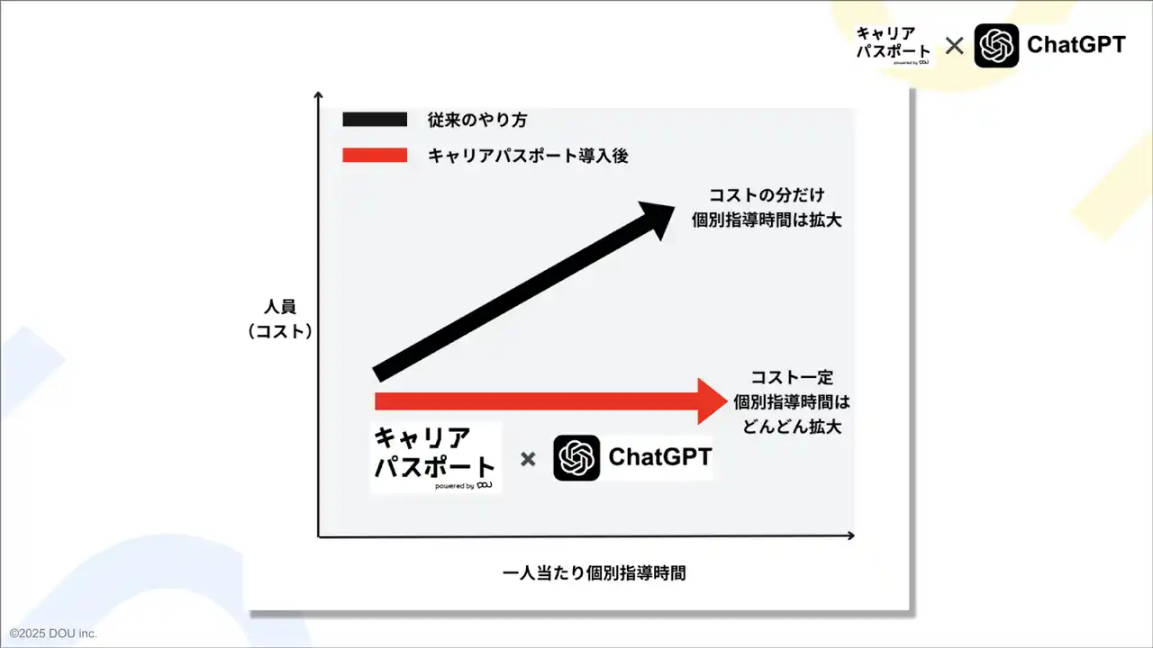 「AIは、教員の『代わり』になるものではありません。むしろ、教員のそばにいる『もう一人のパートナー』です。AIが担える部分を任せることで、教員は事務的な対応や初期支援から解放され、学生一人ひとりとのより本質的な対話や、より高度な指導にリソースを集中させることができます。」(株式会社DOU 事業責任者 赤岩智宏) |