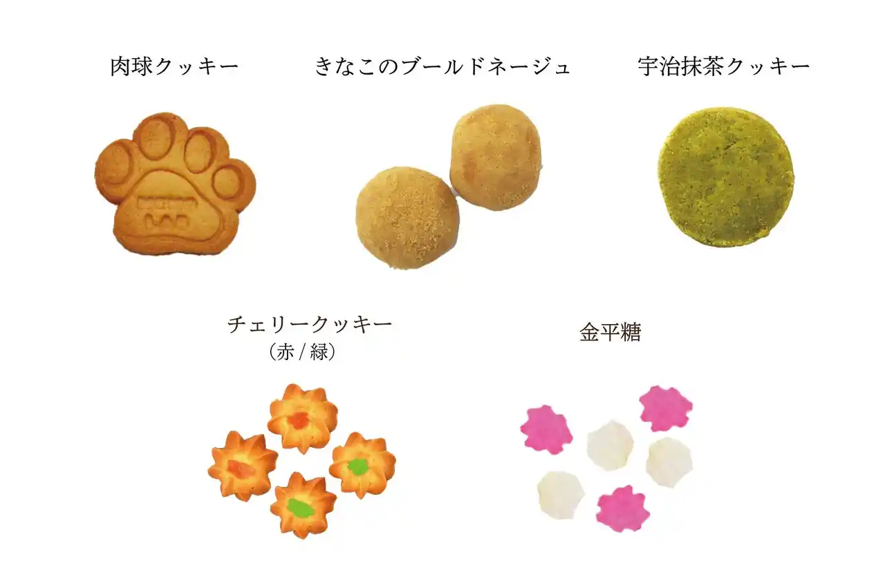 猫クッキー缶を中心に、猫の魅力をスイーツや雑貨を通して表現しています。 |