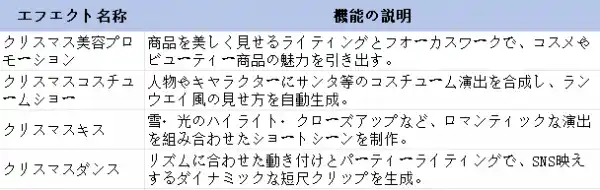 クリスマス美容プロモーション:https://jp.topmediai.com/app/video-effects/christmas-beauty-product-promotion/