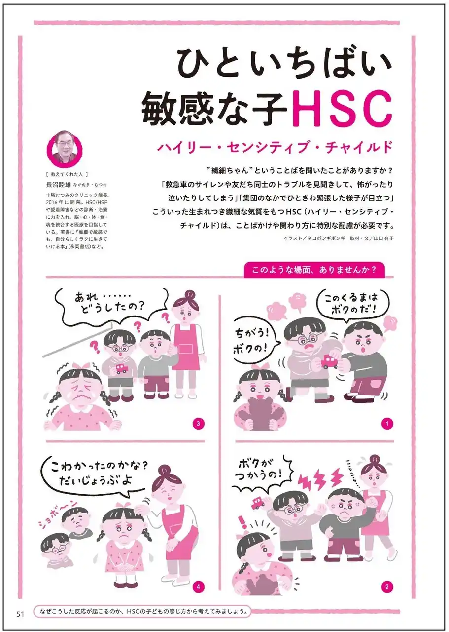 “繊細ちゃん”ということばを聞いたことがありますか? 「救急車のサイレンや友だち同士のトラブルを見聞きして怖がる」「集団のなかでひときわ緊張している」など生まれつき繊細な気質をもつHSC(ハイリー・センシティブ・チャイルド)。 |