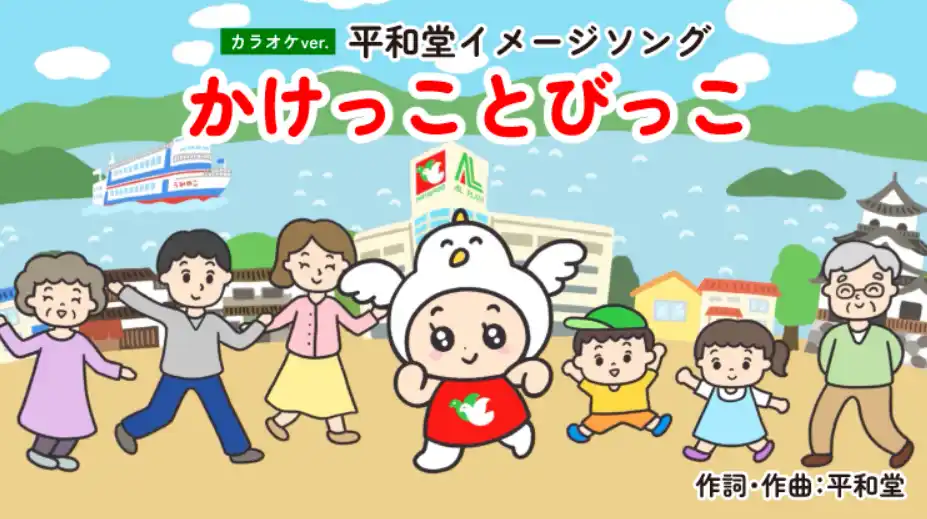 かわのさんとのコラボレーション企画の第一弾として、12月22日(月)より、カラオケJOYSOUNDにて、平和堂イメージソング「かけっことびっこ」の平和堂公式映像バージョンの配信を開始します。演奏中の映像には、かわのさんが手がける「はとっぴー」が登場し、平和堂での「はずむ心のお買い物♪」を表現した動画が流れます。なお、この動画は平和堂公式SNS(YouTube、Instagram、X)でもお楽しみいただくことができます。年末年始の集まりにみんなで歌えばきっと心がはずむ、「かけっことびっこ」をお楽しみください。 |