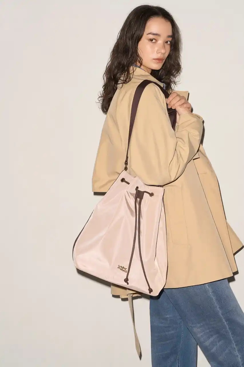 ロゴプレートが映える巾着デザインに、長さ調整可能なハンドルで肩掛け・斜め掛けの2WAY仕様、合皮パイピングの上品さとしっかりとした底マチによる高い収納力を備え、A4サイズにも対応したオンオフ問わず活躍するショルダートートバッグです。 |