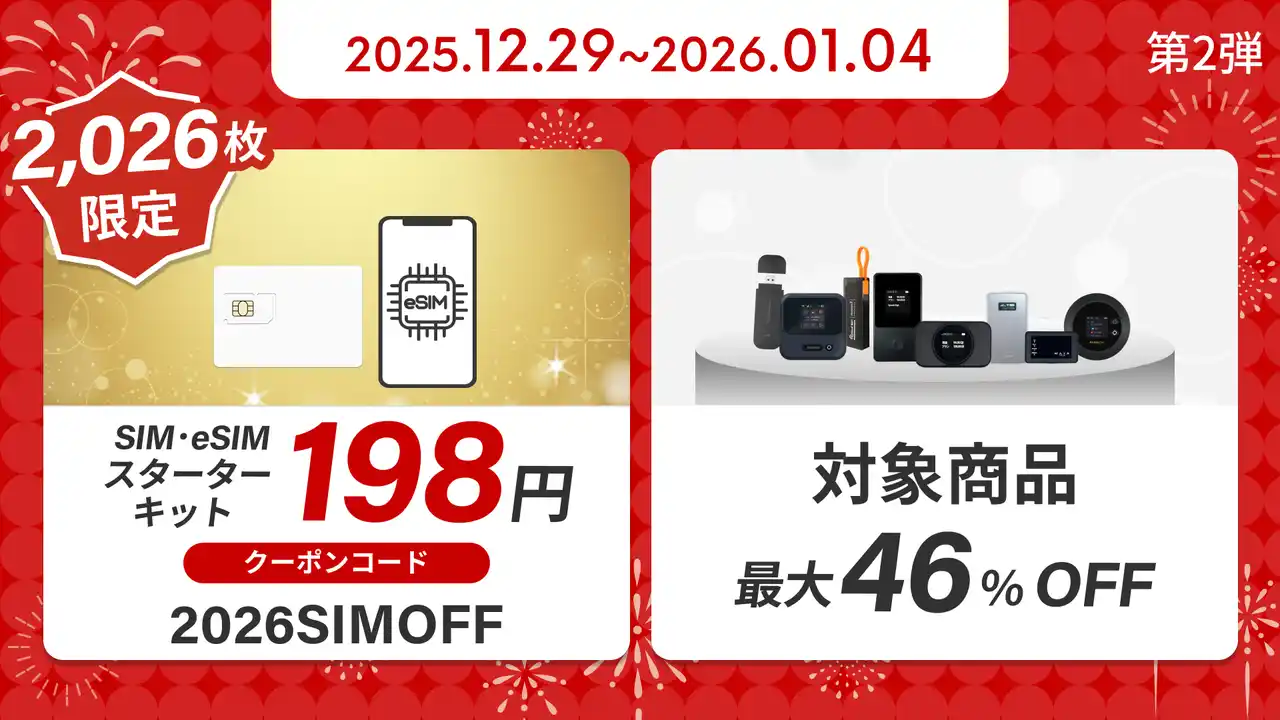 | 2026年の到来を記念し、数字「2026」にちなんだ特別企画を3期間連続で実施。SIMの特価販売から全商品セールまで、リチャージモバイルならではの買い切り式サービスをより手軽に体験いただける内容です。 |