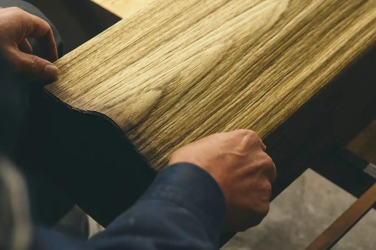 HIROMEIは創業以来、天然木突板の製造を続け、木材を「最後まで使い切る」ことを企業理念として掲げてきました。「Radial Square」はその理念から生まれたプロダクトであり、製材の過程で生じる端材を活かし、職人の手作業によって一点ずつ制作されています。 |