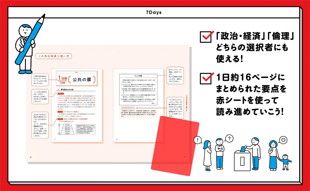 | 本シリーズでは、出題範囲の広い社会科分野から、「歴史総合」と「公共」の要点を7日間に凝縮し、直前期の学習に集中できるよう構成しています。 | |||||||||