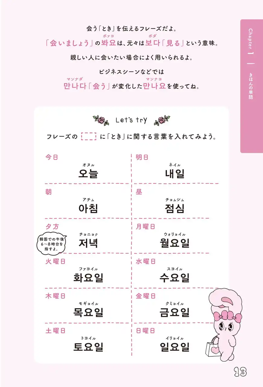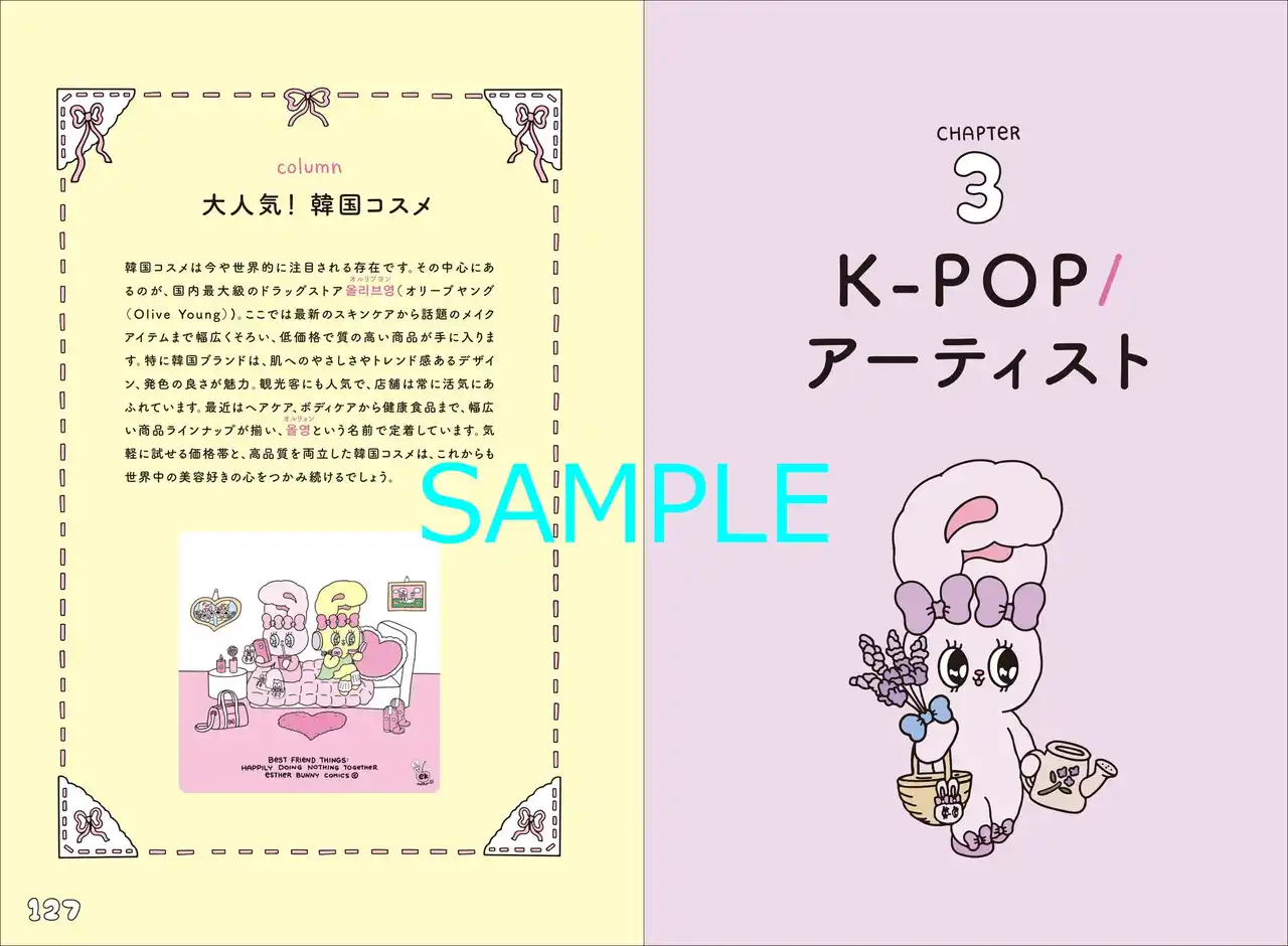 このたび刊行される『エスターバニー 使える韓国語単語&フレーズ集』は、エスターバニー史上初となる韓国語語学書。K-POPや韓国アイドルをきっかけに韓国語に興味を持った読者の方々を、SNSで圧倒的な支持を受けるエスターバニーがキュートに応援する、今までになかった一冊です。 |