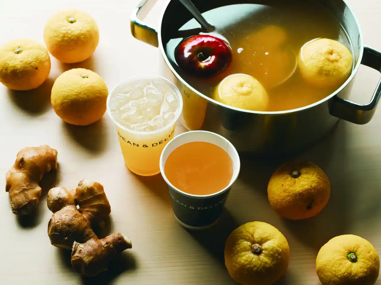 大きな鍋に旬のりんご、ゆず、ジンジャーを入れて、店内でコトコト煮込んでつくる冬においしい自家製ジュースが今年も登場です。旬の黄ゆずの風味が爽やかに広がる、果実とジンジャーのホットジュースは、毎日素材から手作りしているため、店内は心を癒すゆずの香りに包まれます。 |