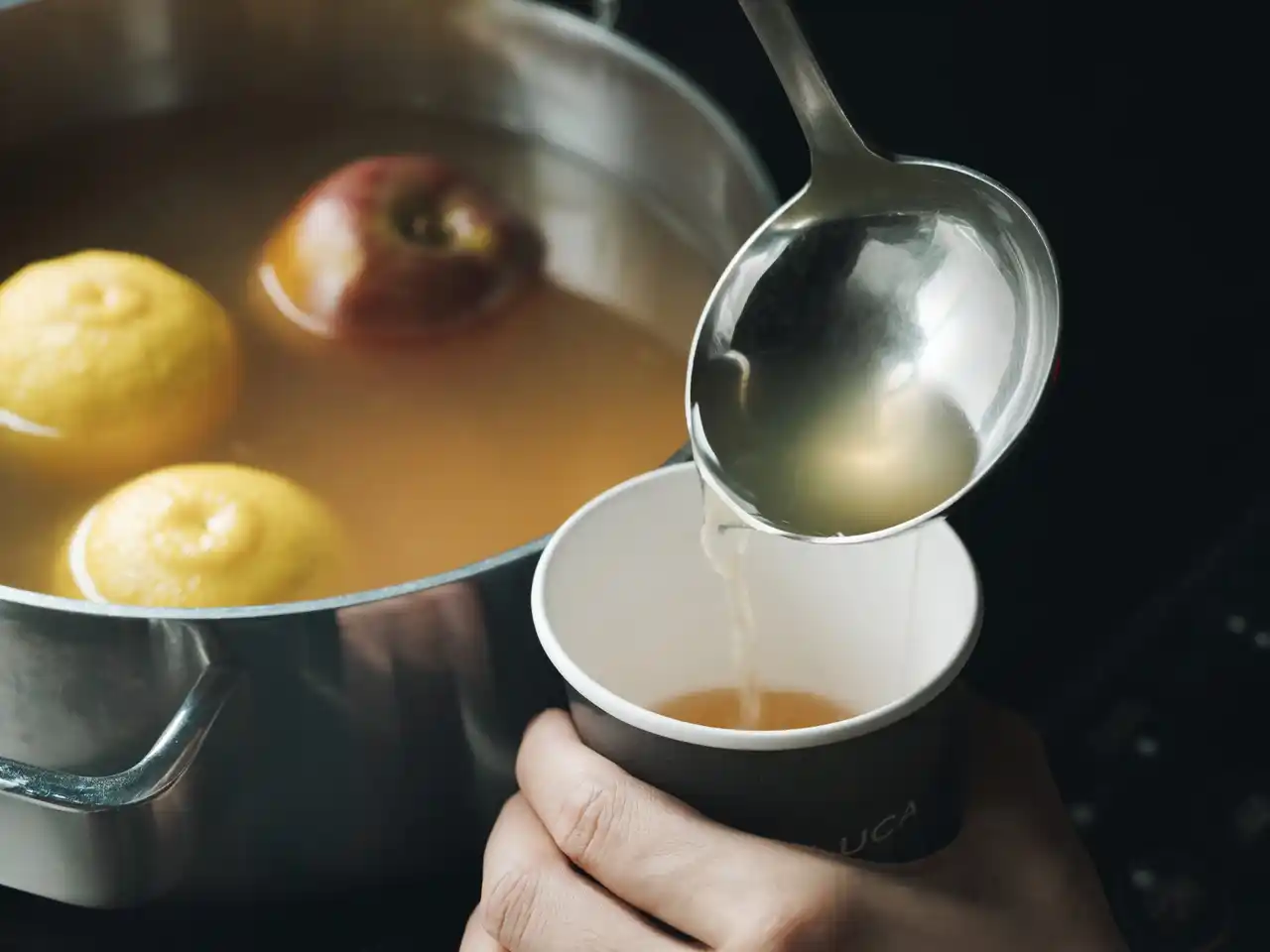 あわせて、冬の定番として毎年好評のホットドリンク「ゆずジンジャーアップル」も登場。旬のりんごと黄ゆず、生姜を大きな鍋でじっくり煮込み、果実の甘酸っぱさと香り、生姜の爽やかな辛み、スパイシーな味わいをおたのしみいただけます。 |