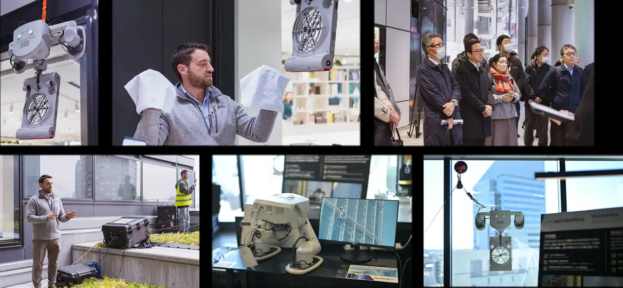 1. Verobotics(ベロボティクス)&東急不動産株式会社 Veroboticsは、全自動外壁清掃ロボットを開発しているイスラエルのスタートアップで、外壁清掃と同時に外壁のデータを収集・管理する事業を行っています。デモデイに先駆けて12月3日に、渋谷サクラステージのセントラルビルの外壁にて、Veroboticsの全自動外壁清掃ロボットが窓を清掃する実証をしました。東急不動産が運営するビルでの本格導入を検討するため、現場担当者が機器を間近で確認し運用方法について説明を受けながら、作業手順などを検証しました。東急不動産は今後、Veroboticsの日本市場での展開に向けて、継続的に支援および連携を進める予定です。 |