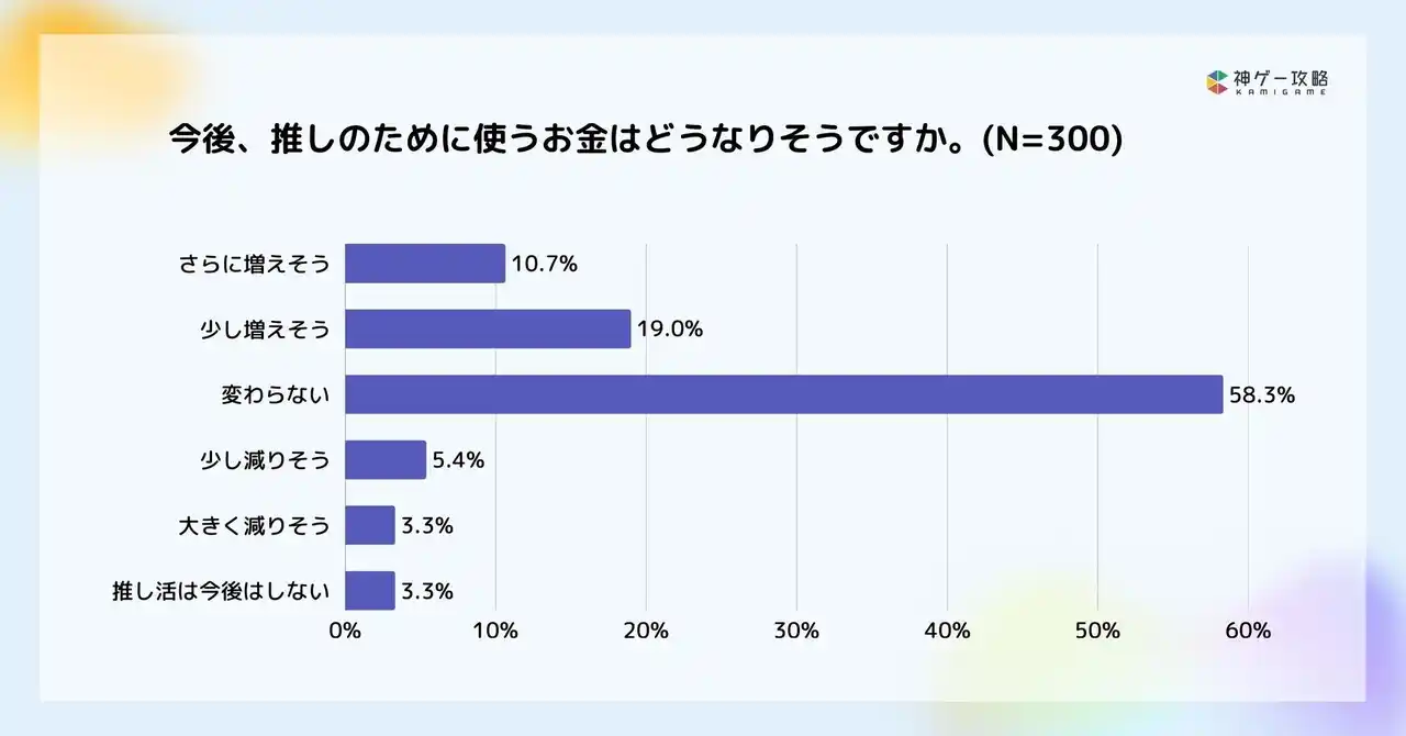 今後、推しのために使うお金の変化は、変わらないという回答が58.3%で最多でした。 |