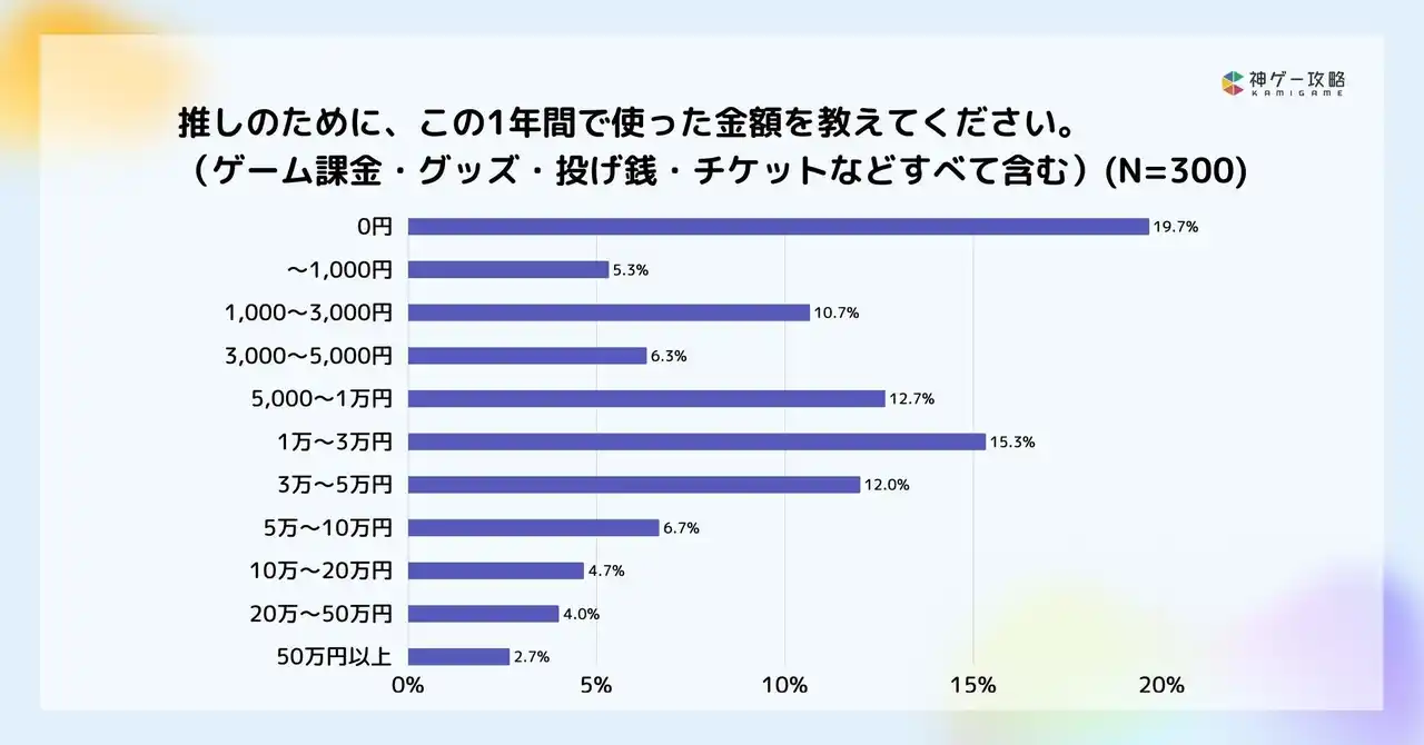 一方で、「1万~3万円」と回答した人も15.3%存在しており、推し活への関わり方や支出額には幅があることが分かります。 |