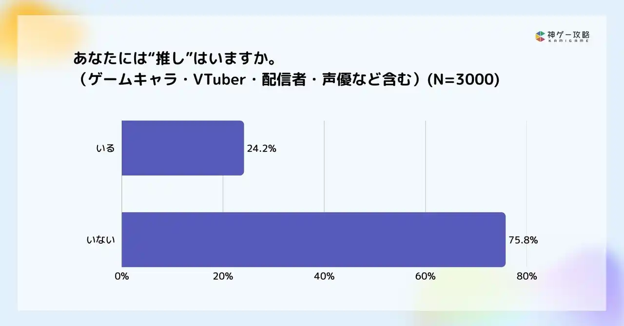 非ゲームユーザーを含む3000人を対象に行った事前調査では、「推しがいる」と回答した人は全体の24.2%という結果でした。 |