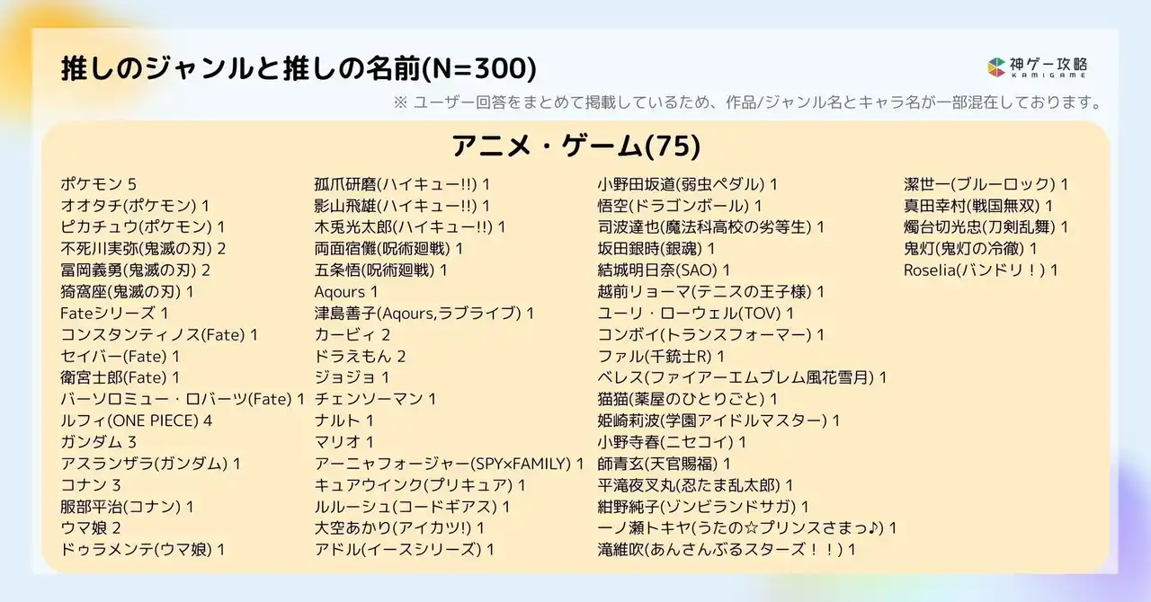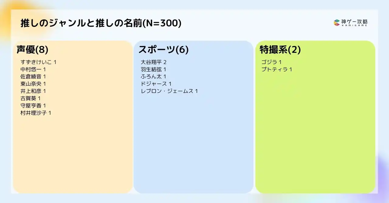 本調査では、このうち「推しがいる」と回答した人の中から、日常的にゲームをプレイしている300名を対象に行った本調査の結果を発表します。 |