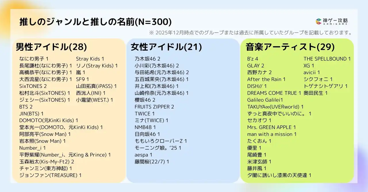 次点で「アニメ・マンガ・ゲームキャラクター」が25%となっており、エンタメコンテンツ全般に推しが分散している傾向が見られます。 |