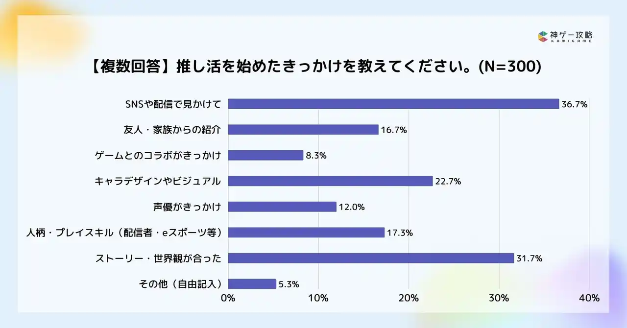 推し活を始めたきっかけとして最も多かったのは、「SNSや配信で知った」の36.7%で、次点では「ストーリーや世界観に共感した」が31.7%という結果でした。 |