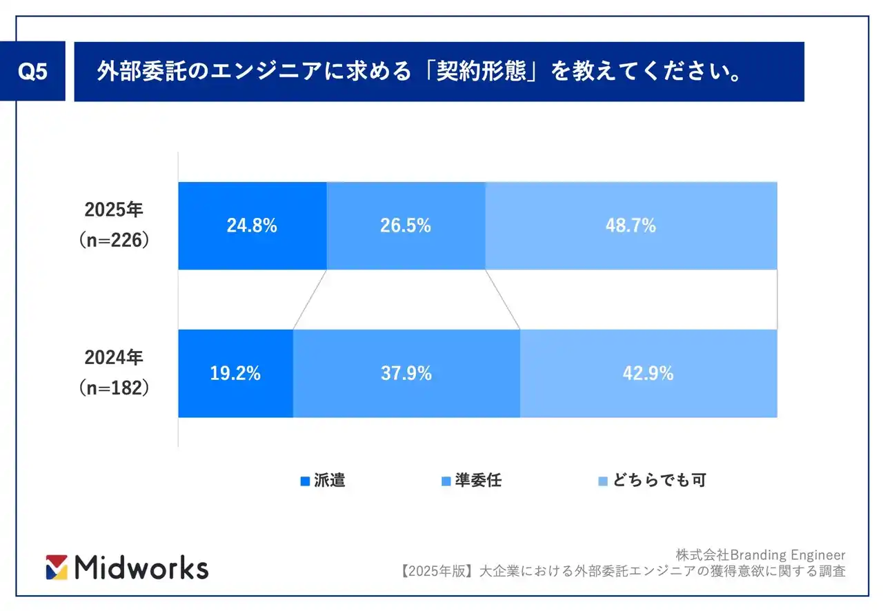 ■外部委託エンジニアに求める契約形態、48.7%が「派遣/準委任のどちらでも可」と回答、昨年より5.8ポイント増 |
