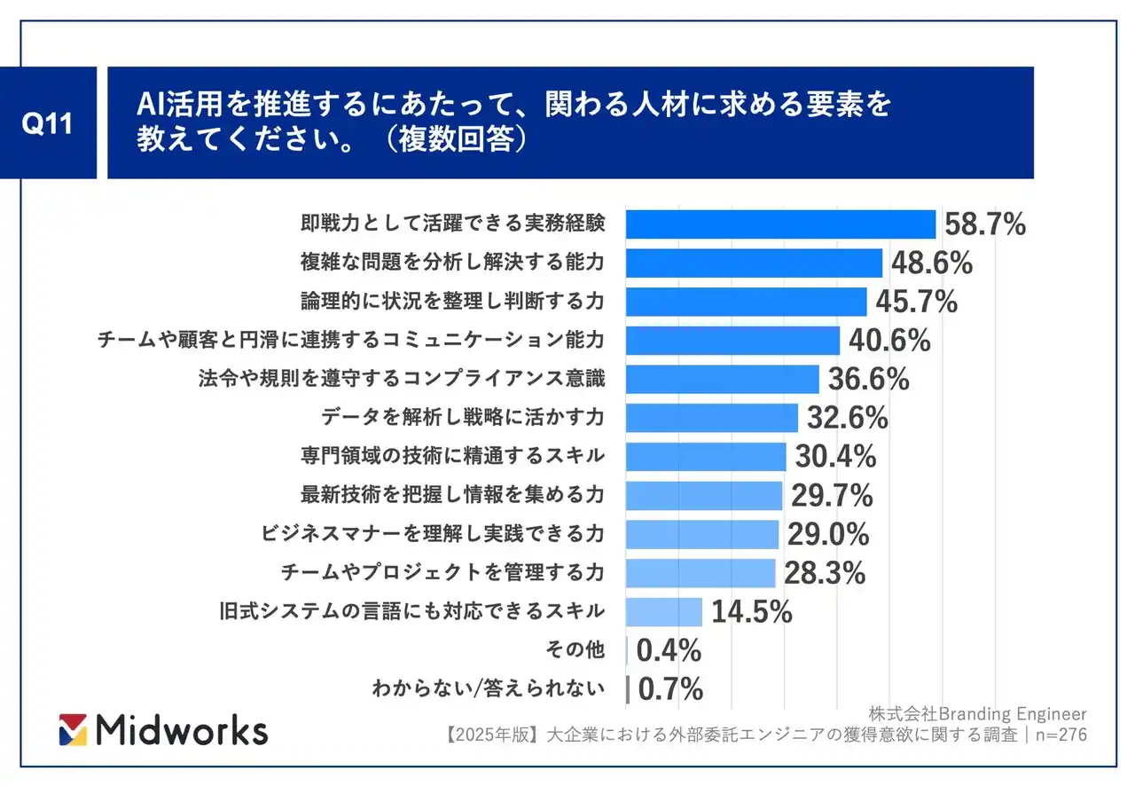 「Q11. Q9で「すでに注力している」「現在は注力していないが、今後注力する予定がある」と回答した方にお聞きします。AI活用を推進するにあたって、関わる人材に求める要素を教えてください。(複数回答)」(n=276)と質問したところ、「即戦力として活躍できる実務経験」が58.7%、「複雑な問題を分析し解決する能力」が48.6%、「論理的に状況を整理し判断する力」が45.7%という回答となりました。 |