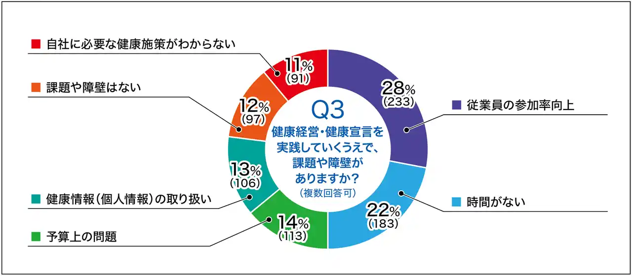 | また、健康経営を実践していくうえでの課題や障壁については、「従業員の参加率向上(28%)」、「時間がない(22%)」が多くを占めています(Q3)。 | |||||||||