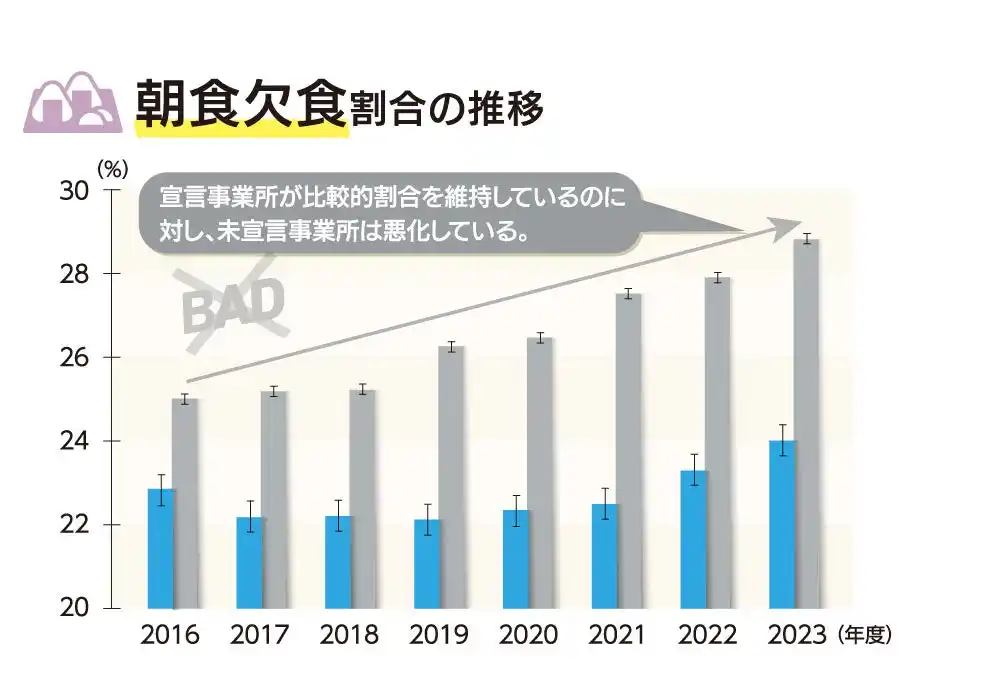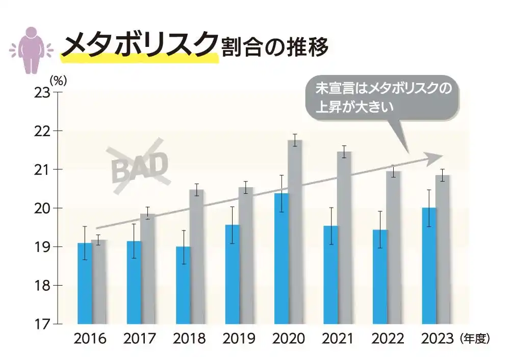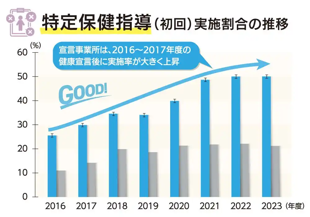 | 協会けんぽ京都支部が収集した2016~2023年度の健康データ(健康宣言事業所と未宣言事業所)の分析では、特定保健指導と関連する指標に顕著な差が出ています。 | |||||||||