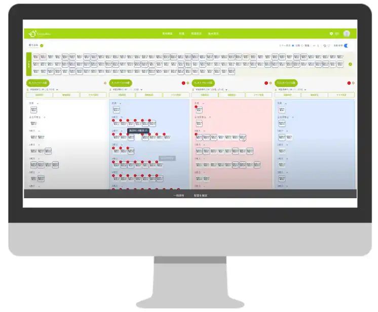 職員をドラッグ&ドロップで移動し、複数園・複数クラスの配置を横並びで比較できます。 |