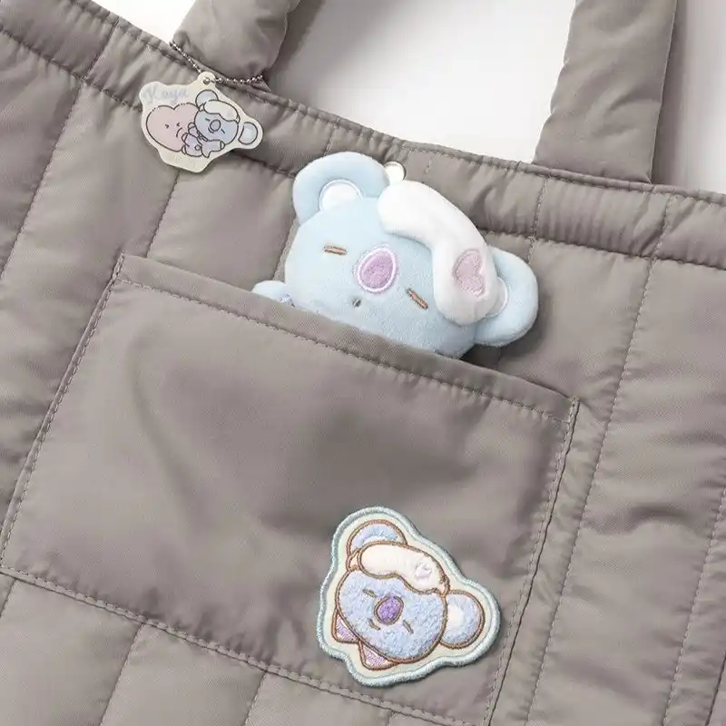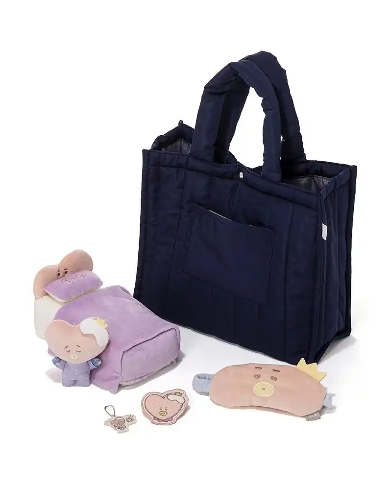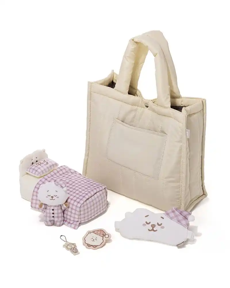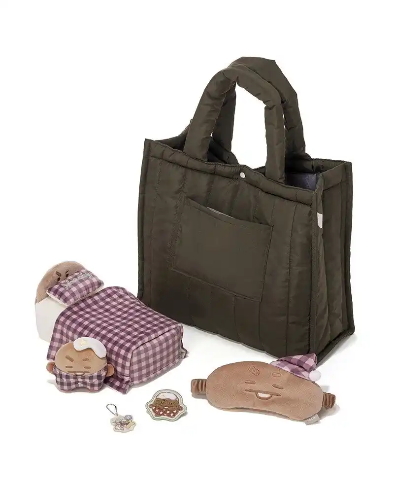 パジャマ姿のマスコットは、ねむねむした表情がたまらない可愛さ。キルティングバッグは外側はシンプルで使いやすく、バッグの中はねむねむアートの総柄になっています。表のポケットにはゴムがついており、そこへマスコットを通すとポケットから顔を出した状態で固定され、まるでお布団から覗いているような姿を楽しむことができます。 |
