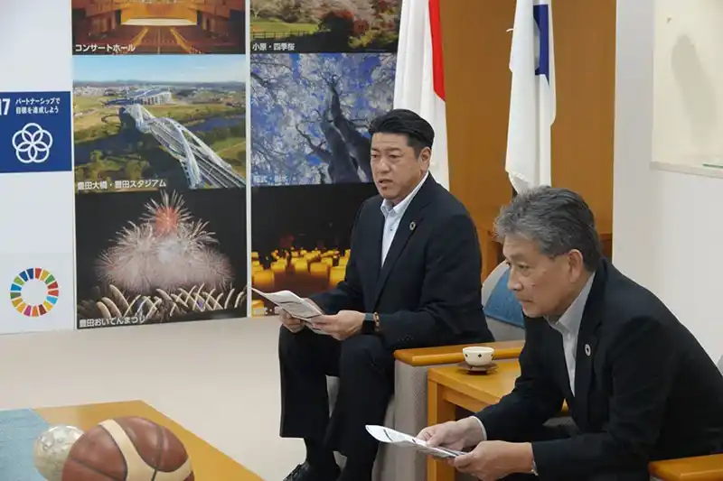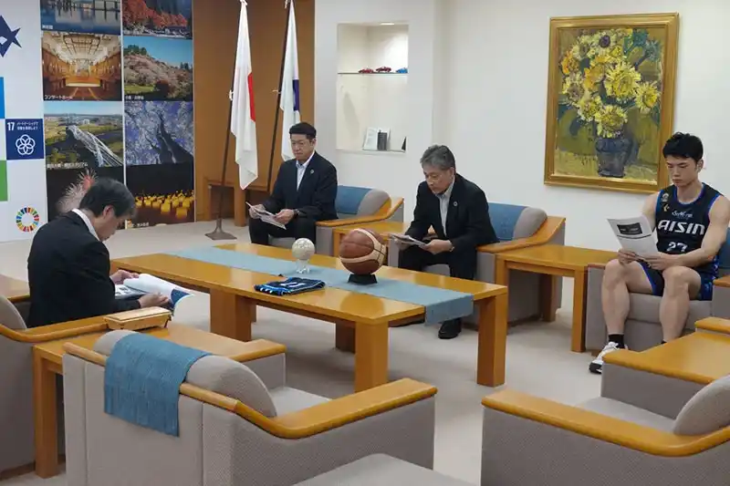2025年6月24日(火)、取締役社長・寺部康弘と佐古チームディレクター、#27 石井講祐選手が豊田市の太田稔彦市長を表敬訪問いたしました。2024-25シーズンの活動報告と2025-26シーズンに向けての意気込みをお伝えし、併せて西三河地区の皆さまのご支援もあり、2年連続のチャンピオンシップ出場を果たせたことへの御礼を申し上げました。 | |||||||||