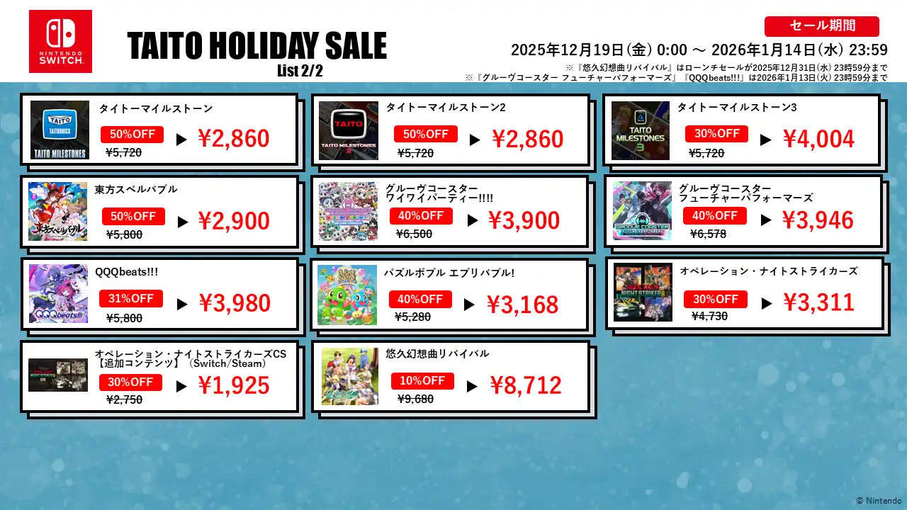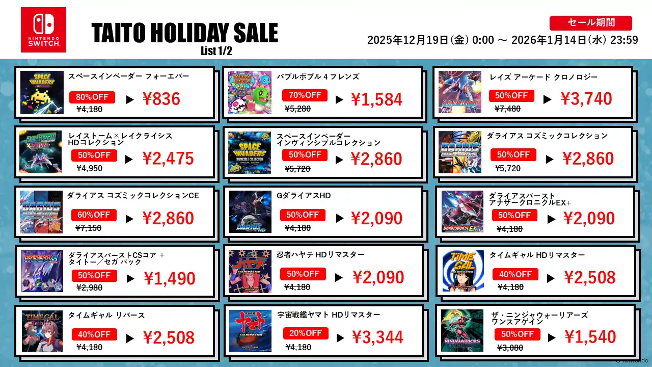 株式会社タイトー(本社:東京都新宿区、以下タイトー)は、対象のNintendo Switch(TM)用ソフト(ダウンロード版)やSteam用ソフトが最大80%オフとなる「タイトーホリデーセール2025」を実施いたします。 |