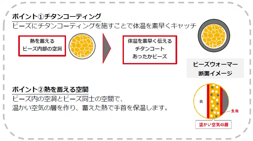 ・体温を素早く伝えるビーズが、手首をやさしく包みこんで保温 |