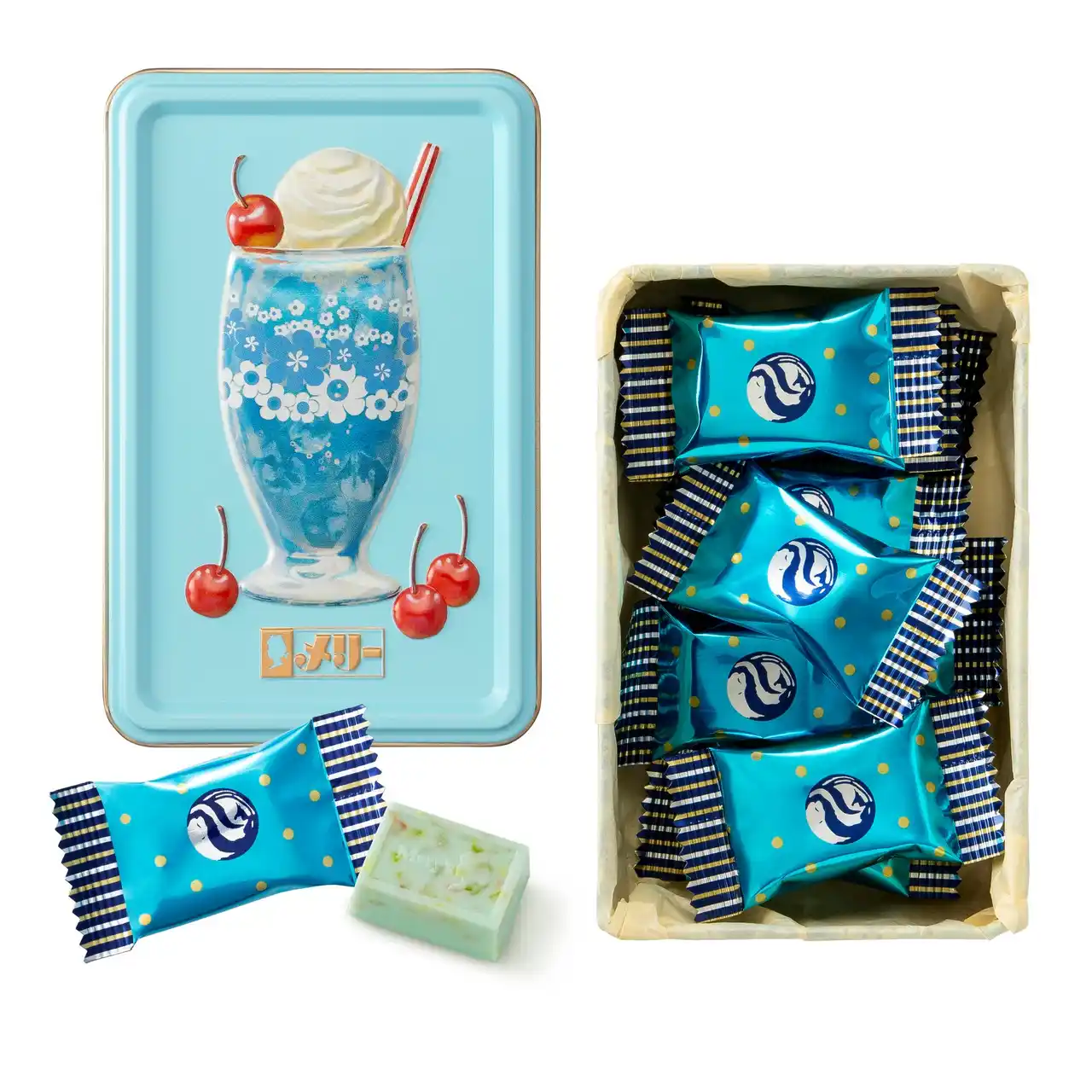 レトロ喫茶に並ぶ色とりどりのドリンクやスイーツをモチーフにしたメリーチョコレートブランド「はじけるキャンディチョコレート。」が、昭和の可愛いを詰め込んだレトロな器が人気の「アデリアレトロ」とコラボレーションしました。 |