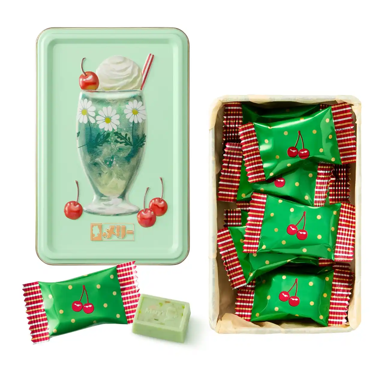 アデリアレトロの、白い水玉模様と赤いお花がキュートな「花だん」柄の台付きグラスをデザインした缶に、甘酸っぱい、いちごソーダ風味のパチパチキャンディ入りのチョコレートを詰め合わせました。 |